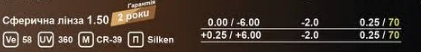 Диоптрии (sph) | -0.25, -0.5, -0.75, -1, -1.25, -1.5, -1.75, -2, -2.25, -2.5, -2.75, -3, -3.25, -3.5, -3.75, -4, -4.25, -4.5, -4.75, -5, -5.25, -5.5, -5.75, -6, 0.25, 0.5, 0.75, 1, 1.25, 1.5, 1.75, 2, 2.25, 2.5, 2.75, 3, 3.25, 3.5, 3.75, 4, 4.25, 4.5, 4.75, 5, 5.25, 5.5, 5.75, 6 |