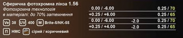 Свойства линзы | фотохромные, астигматические |
