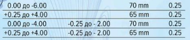 Диоптрии (sph) | -0.25, -0.5, -0.75, -1, -1.25, -1.5, -1.75, -2, -2.25, -2.5, -2.75, -3, -3.25, -3.5, -3.75, -4, -4.25, -4.5, -4.75, -5, -5.25, -5.5, -5.75, -6, 0.25, 0.5, 0.75, 1, 1.25, 1.5, 1.75, 2, 2.25, 2.5, 2.75, 3, 3.25, 3.5, 3.75, 4 |