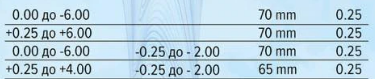 Диоптрии (sph) | -0.25, -0.5, -0.75, -1, -1.25, -1.5, -1.75, -2, -2.25, -2.5, -2.75, -3, -3.25, -3.5, -3.75, -4, -4.25, -4.5, -4.75, -5, -5.25, -5.5, -5.75, -6, 0.25, 0.5, 0.75, 1, 1.25, 1.5, 1.75, 2, 2.25, 2.5, 2.75, 3, 3.25, 3.5, 3.75, 4, 4.25, 4.5, 4.75, 5, 5.25, 5.5, 5.75, 6 |