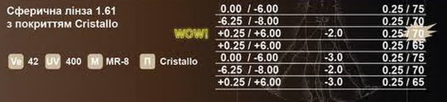 Диоптрии (sph) | -0.25, -0.5, -0.75, -1, -1.25, -1.5, -1.75, -2, -2.25, -2.5, -2.75, -3, -3.25, -3.5, -3.75, -4, -4.25, -4.5, -4.75, -5, -5.25, -5.5, -5.75, -6, -6.25, -6.5, -6.75, -7, -7.25, -7.5, -7.75, -8, 0.25, 0.5, 0.75, 1, 1.25, 1.5, 1.75, 2, 2.25, 2.5, 2.75, 3, 3.25, 3.5, 3.75, 4, 4.25, 4.5, 4.75, 5, 5.25, 5.5, 5.75, 6 |